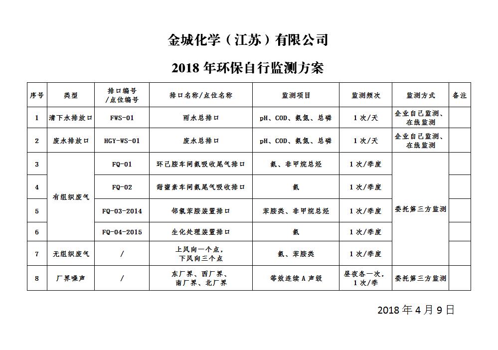 金城化學(xué)2018年環(huán)保自行監(jiān)測(cè)方案