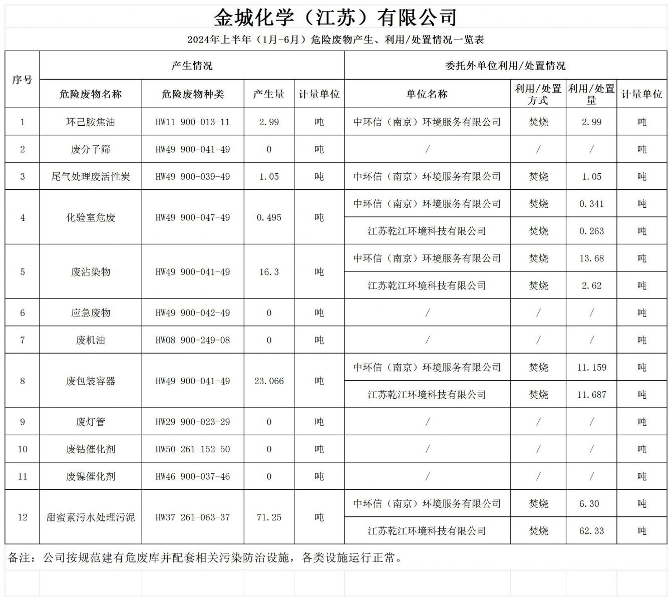 金城化學(江蘇)有限公司2024年上半年(1月-6月)危險危物產(chǎn)生、利用/處置情況一覽表